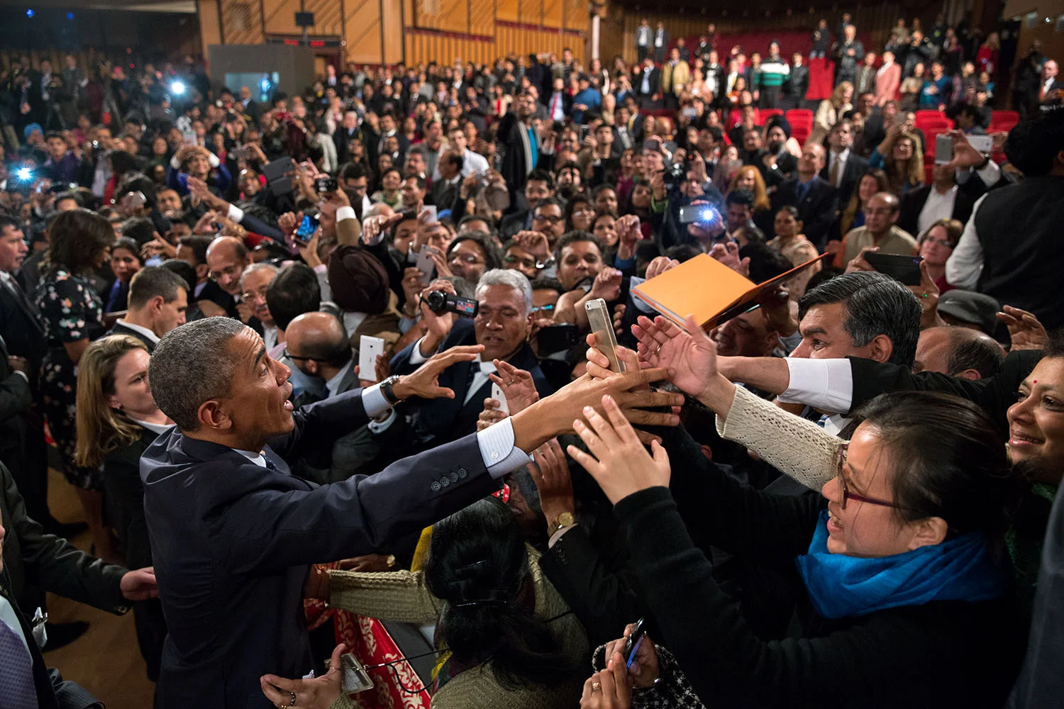 U.S. President Barack Obama greets the audience following his speech at Siri Fort Auditorium in New Delhi, India, on January 27, 2015. Photo: Pete Souza, White House. United States Government Work. 2015.