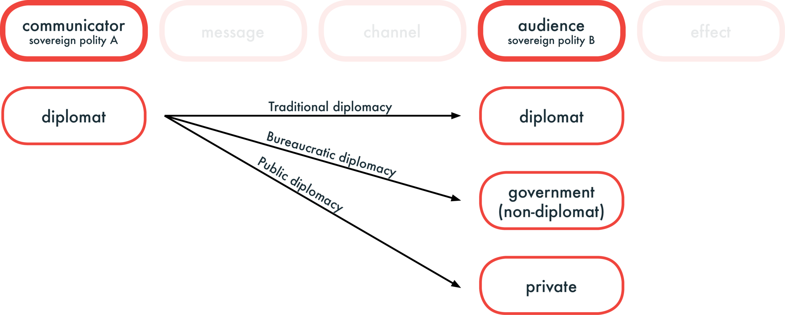 Based on the three possible categories of actors who can be an audience, there are three subsets of diplomacy under the communicator/audience scheme: traditional, bureaucratic, and public. In other words, diplomats from one sovereign polity can communicate across sovereign jurisdictions with: