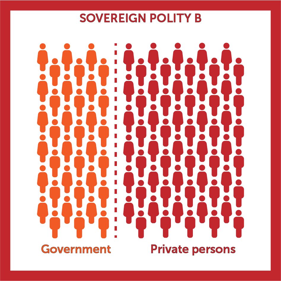 These categories are mutually exclusive and collectively exhaustive. This means that each actor within a sovereign polity belongs to only one of the three categories.