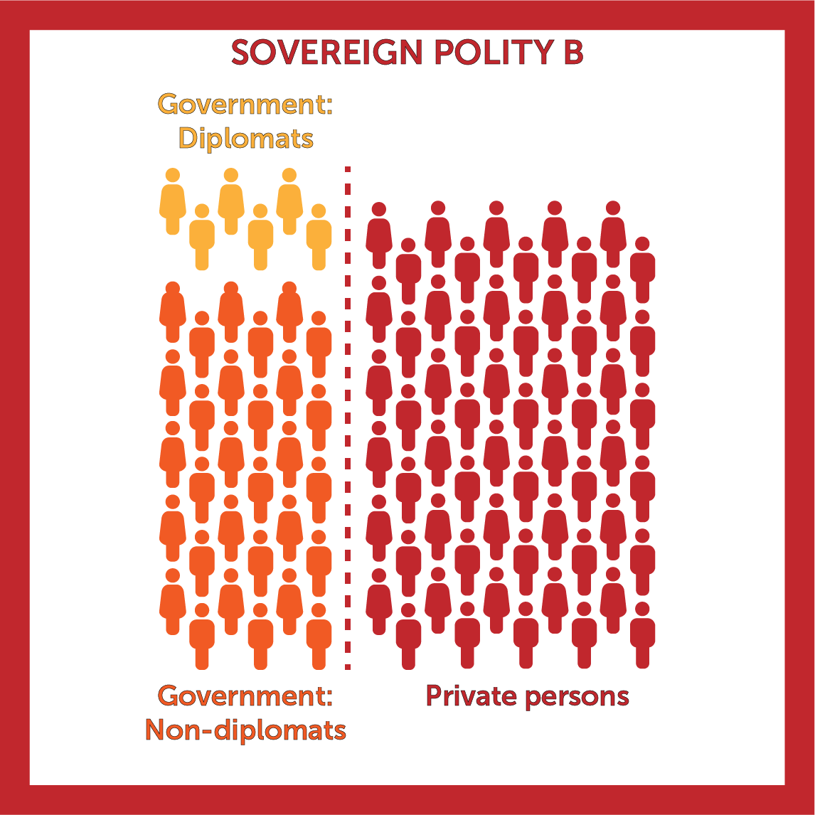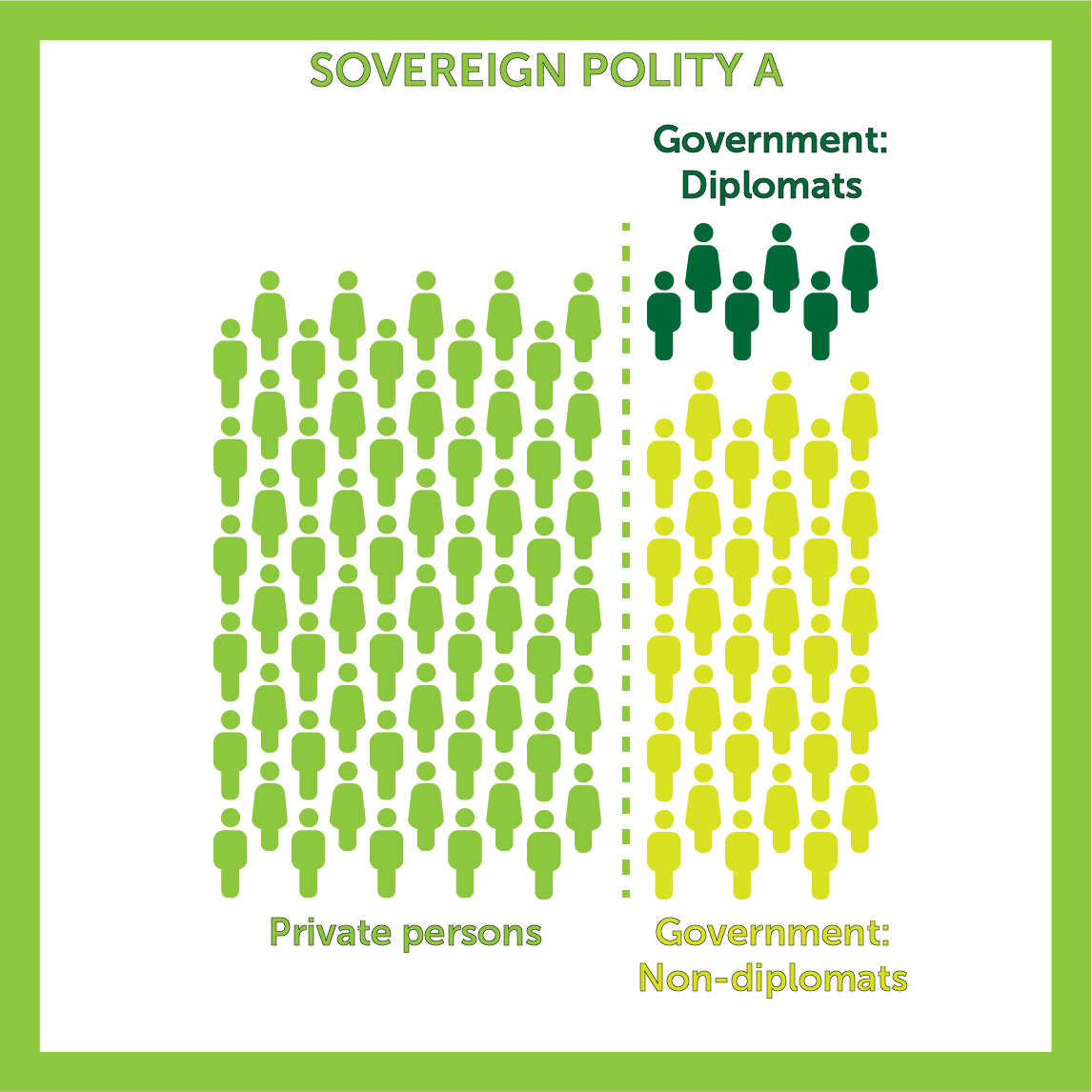 By combining 1) political sovereignty, 2) duly accredited representativeness, and 3) communication across sovereign jurisdictions, I grouped a sovereign polity's population into three categories of actors: